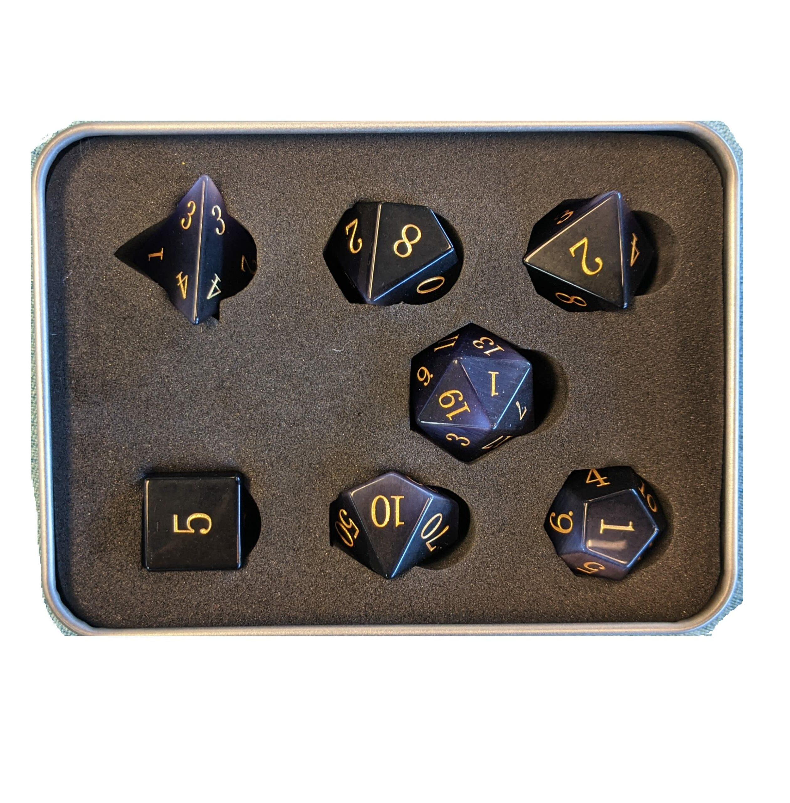 CHC: 16mm Gemstone Poly Dice Set (7) – Purple Cymophanite with Gold Numbers