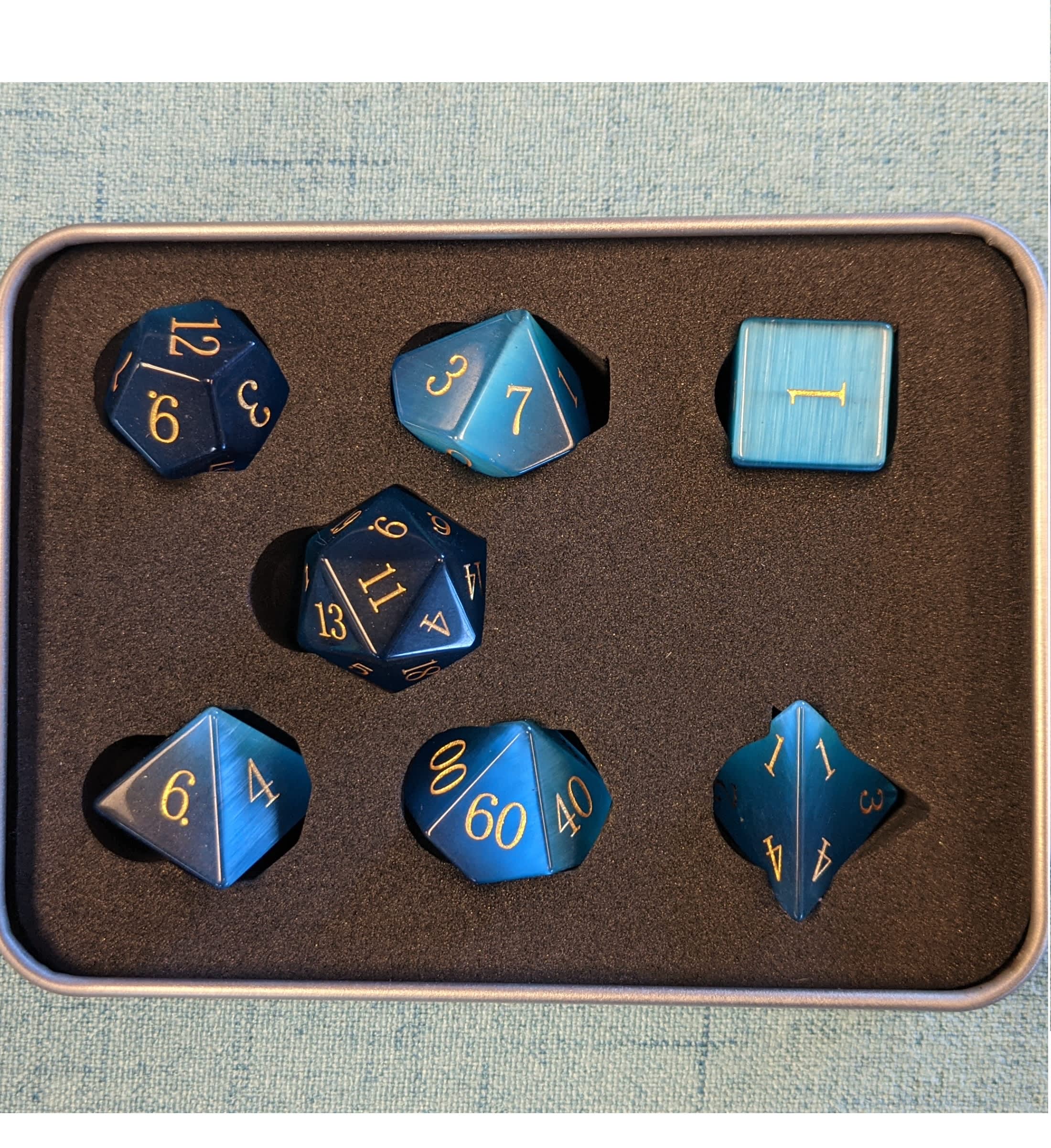 CHC: 16mm Gemstone Poly Dice Set (7) – Sea Blue Cymophanite with Gold Numbers