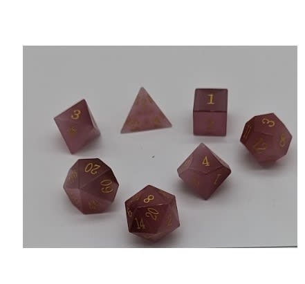 CHC: 16mm Gemstone Poly Dice Set (7) – Pink Cymophanite w/Gold Numbers